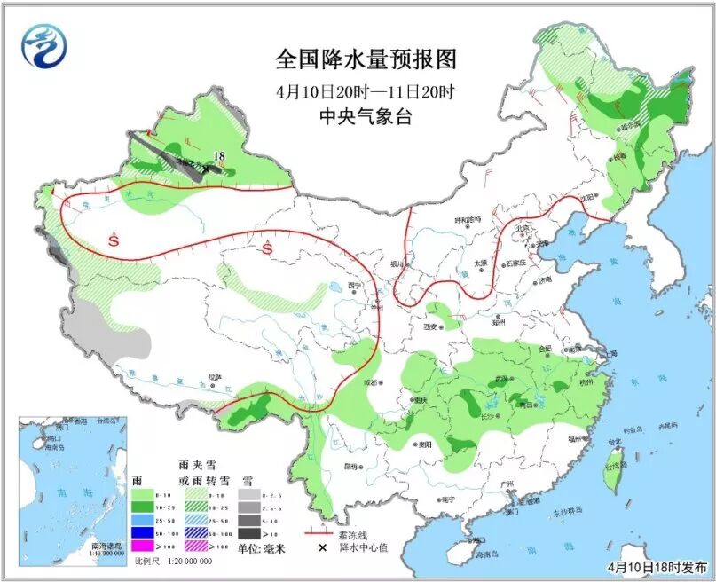 5)4月10日20时至11日20时,新疆阿勒泰和沿天山地区、西藏西部和南部、黑龙江等地的部分地区有小到中雪或雨夹雪,新疆沿天山地区有大到暴雪。西南地区东部、江南中北部、江汉、江淮西部、黑龙江等地有小到中雨。