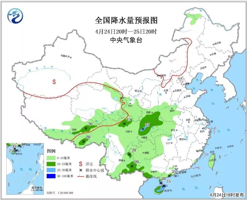 6)4月24日20时至25日20时,四川东北部、川西高原北部、陕西南部、云南东部、广西南部、广东西南沿海、海南岛等地的部分地区有中雨,其中四川盆地东部局地有大雨,雷州半岛、海南岛中东部局地有大到暴雨,上述局部地区将伴有短时强降水等强对流天气。