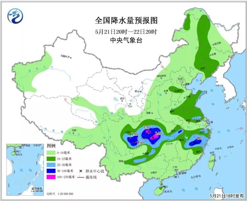 6)5月21日20时至22日20时,西南地区东部、江汉南部、江南北部、黄淮东部等地有中到大雨,其中,四川南部和东部、重庆、湖北西南部、江西东部、浙江西南部、福建北部等地的部分地区有暴雨,局地大暴雨(100-150毫米)。