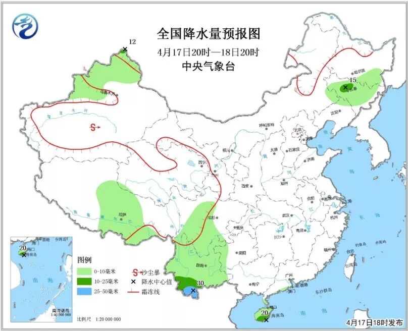5)4月17日20时至18日20时,新疆北部及西部山区、青藏高原中部等地的部分地区有小到中雪或雨夹雪;新疆西北部、吉林、西南地区中南部、海南等地有小到中雨,局地大雨,上述部分地区将伴有短时强降水等强对流天气。
