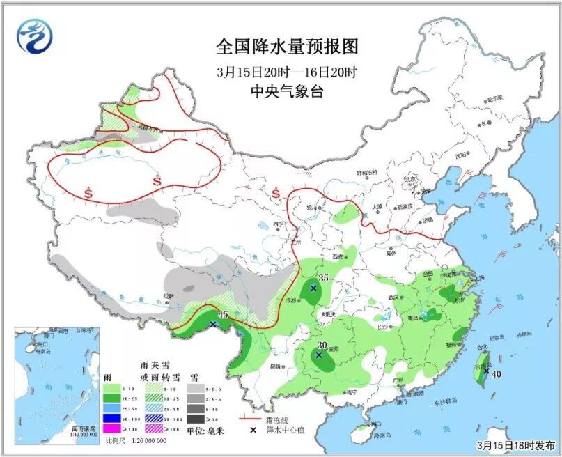 6)3月15日20时至16日20时,新疆西北部、青藏高原南部等地有小到中雪或雨夹雪。四川盆地中西部、西藏东南部、云南西北部和东部、贵州、湖北东部、江淮南部、江南大部、华南北部等地有小到中雨,局地有大雨,上述局地并将伴有雷暴大风或短时强降水等强对流天气。