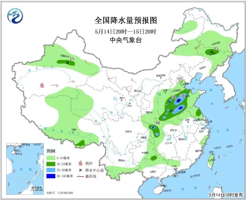 6)5月14日20时至15日20时,黄淮地区有分散性强降雨。华北南部、黄淮大部、新疆沿天山地区、吉林中部、重庆北部、湖北西南部等地的部分地区有中到大雨,其中河南北部和东部、山东西部等地的局部地区有暴雨(50~70毫米),上述地区并伴有短时强降水、雷暴大风等强对流天气。