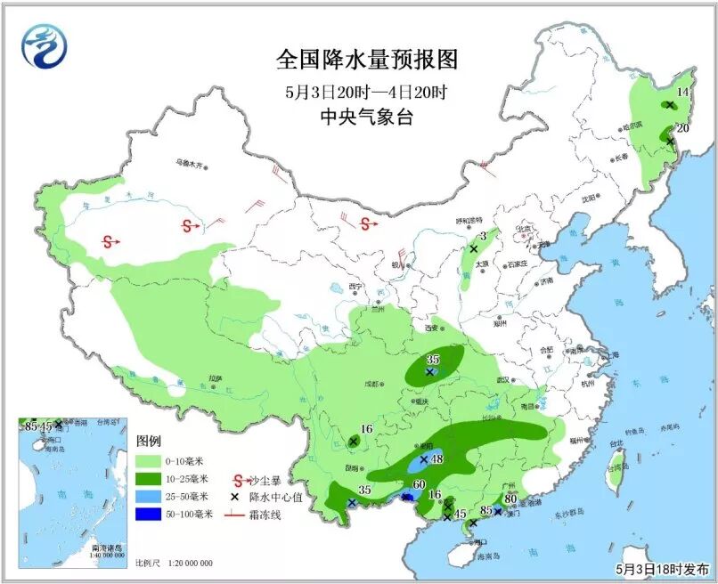 5)5月3日20时至4日20时,黑龙江东部、吉林东部、西藏大部、西北地区东南部、西南地区、江汉大部、江南中西部、华南大部等地有小到中雨,其中,云南东南部、贵州南部、广西西部和南部、广东南部局部有大雨或暴雨,上述局部地区将伴有雷暴大风、短时强降水等强对流天气。