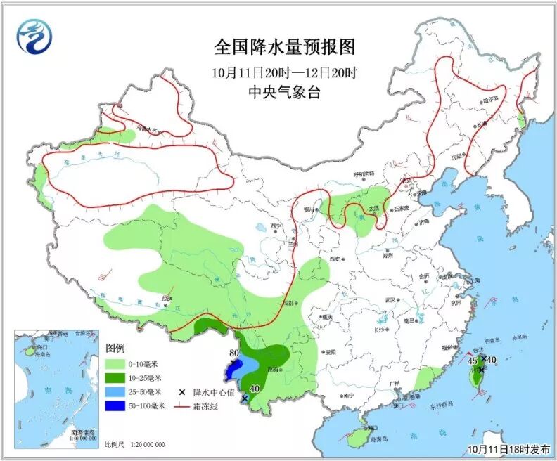 6)10月11日20时至12日20时,西藏中东部、青海西部和南部等地的部分地区有小到中雪或雨夹雪,局地大雪。华北西部、西南地区中西部、西藏东南部、海南岛及台湾岛等地的部分地区有小到中雨,其中,云南西部等地部分地区有大雨,局地暴雨(50~80毫米)。内蒙古中部、新疆东部和沿天山一带、西藏中部等地部分地区有4~6级风。