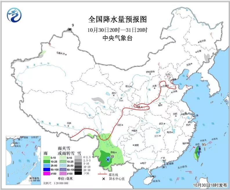 6)10月30日20时至31日20时,新疆西南部和阿勒泰北部、吉林东部等地有小到中雪或雨夹雪,阿勒泰北部局地有大雪(5~9毫米)。云南西南部和中部、台湾岛中东部等地的部分地区有中到大雨,其中,台湾岛北部和东部等地部分地区有暴雨(50~95毫米)。