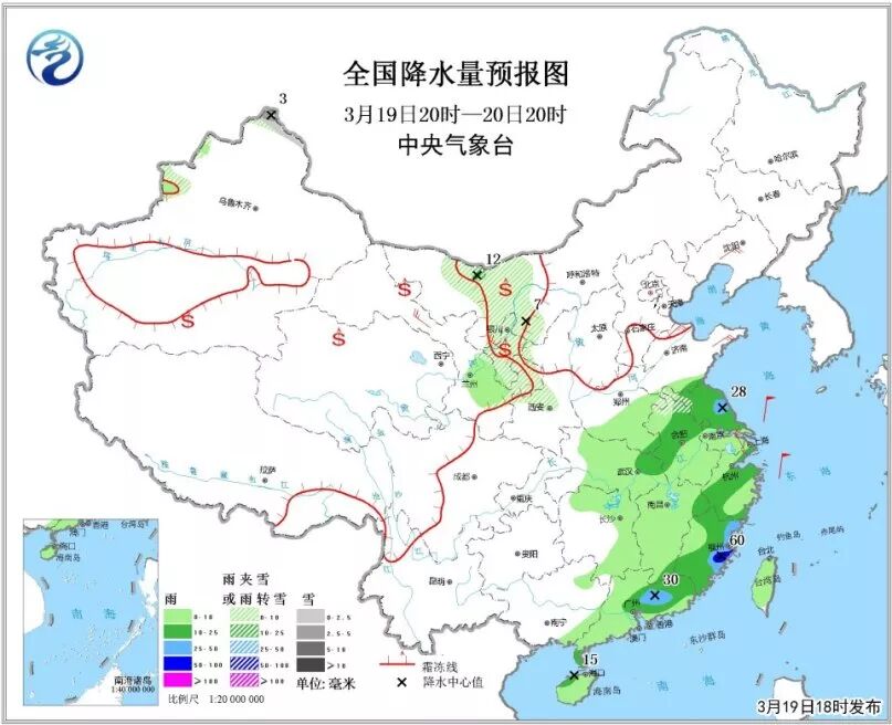 6)3月19日20时至20日20时,内蒙古西部、宁夏、陕西西部等地有雨夹雪或小雪。黄淮南部、江淮、江汉中部和东部、江南中部和东部、华南东部等地有小到中雨,其中福建东南部、广东东北部、江苏等地局地有大雨或暴雨(30~60毫米),上述局部地区并将伴有短时强降水或雷暴大风等强对流天气。