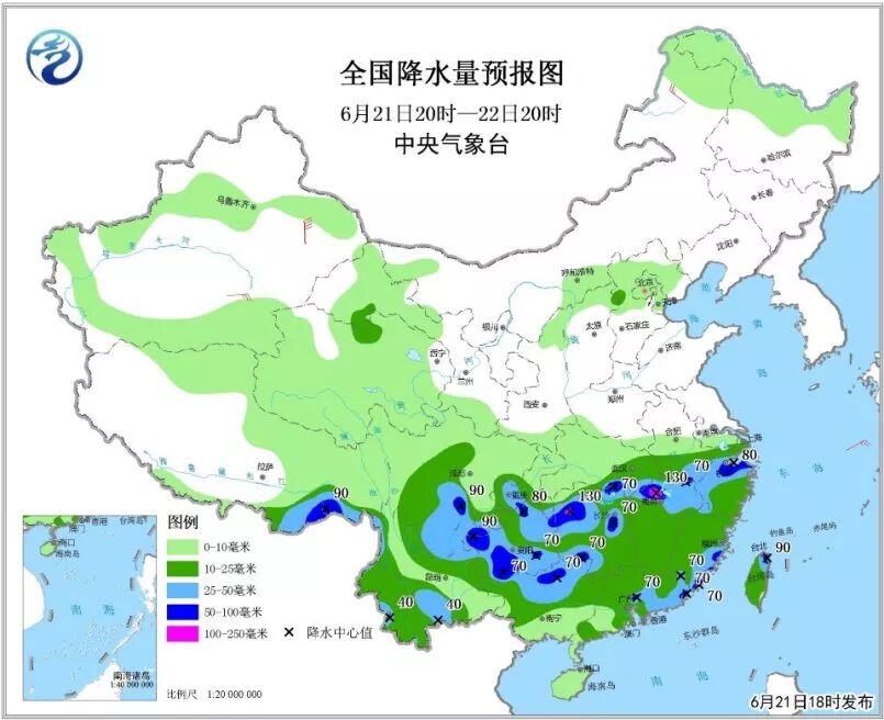 6)6月21日20时至22日20时,四川盆地南部、贵州大部、云南东北部和东南部、江南西部和北部、广西北部、广东东部、福建东南部沿海及台湾岛北部等地的部分地区有大到暴雨,局地大暴雨。