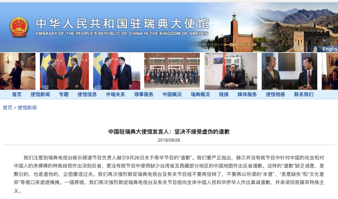 针对瑞典电视台娱乐频道节目负责人赫尔9月26日关于辱华节目的“道歉”,中国驻瑞典大使馆发言人表示,赫尔并没有作出深刻反省,坚决不接受虚伪的道歉。