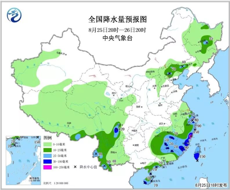 6)8月25日20时至26日20时,黑龙江东南部、辽宁西部、河北北部、北京、江南大部、四川盆地西南部、云南西部、华南南部和东部、海南岛、台湾岛等地部分地区有中到大雨,其中,上海东部、江西中南部、浙江东部、福建东部、广东西南部沿海、海南岛东部和南部、台湾岛中南部等地的部分地区有暴雨,局地大暴雨(100~150毫米)。