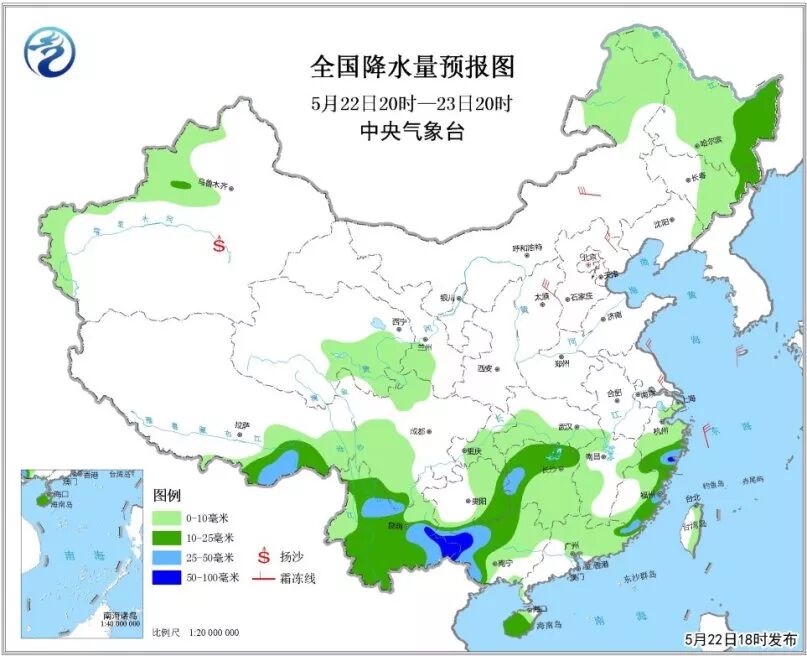 6)5月22日20时至23日20时,云南大部、广西中西部、湖南北部和西部、浙江南部、福建东部、西藏地区东南部以及黑龙江北部等地的部分地区有中到大雨,其中,云南东部、广西西部等地的部分地区有暴雨(50~80毫米)。