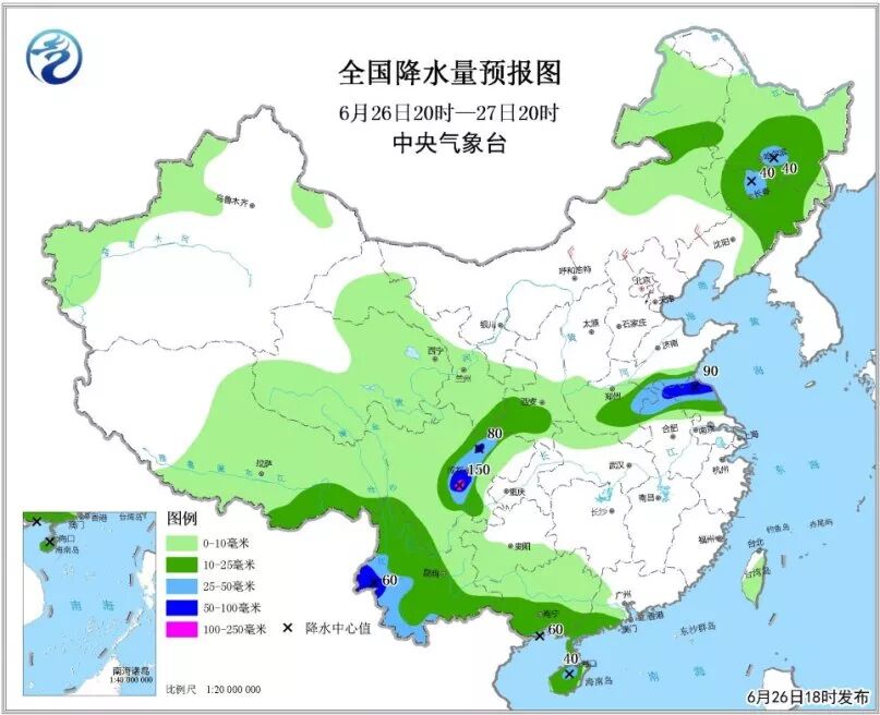 6)6月26日20时至27日20时,山东南部、河南东部、安徽北部、江苏北部、四川盆地西部及云南西部和南部等地的部分地区有大雨或暴雨,其中,四川盆地西南部局地有大暴雨(100~150毫米)。