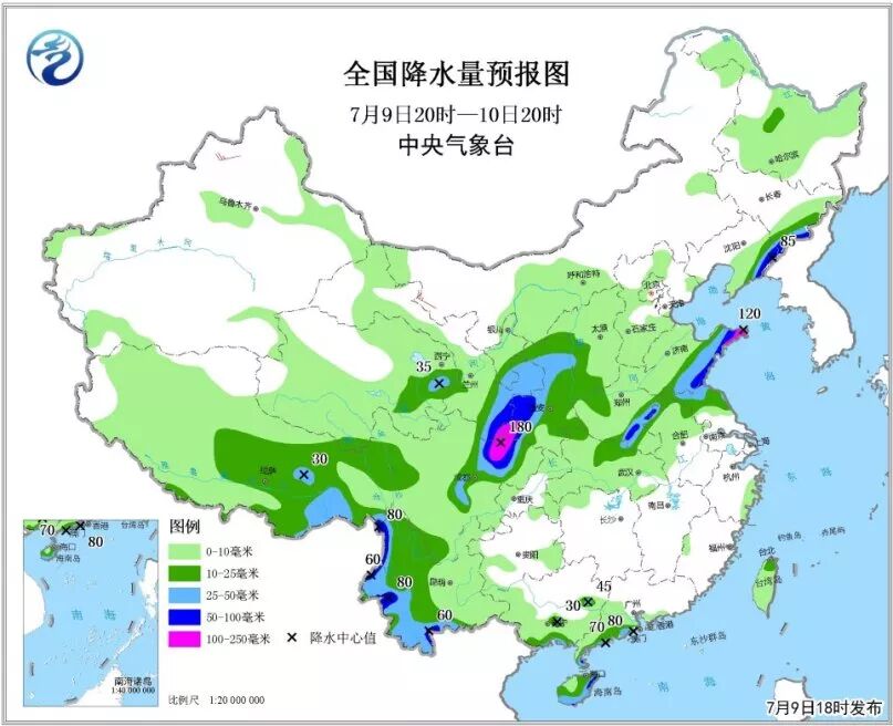 7)7月9日20时至10日20时,主雨带位于西北地区东部、黄淮等地。四川盆地西部、西北地区东部、黄淮南部等地有大到暴雨,其中,甘肃南部、陕西西南部、四川盆地西北部、山东半岛南部等地局地有大暴雨。