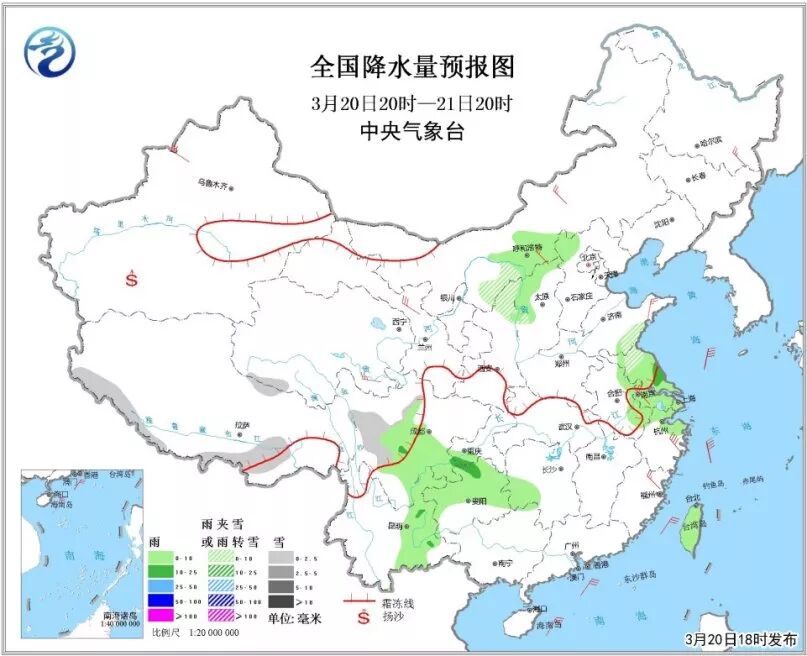 6)3月20日20时至21日20时,黄淮东南部、陕西东北部、川西高原、西藏南部等地有小雪或雨夹雪。江淮东部、西南地区东部、云南东部等地有小到中雨。内蒙古中部、江淮东部、江南东部等地有4~6级风,南疆盆地等地有浮尘或扬沙天气。