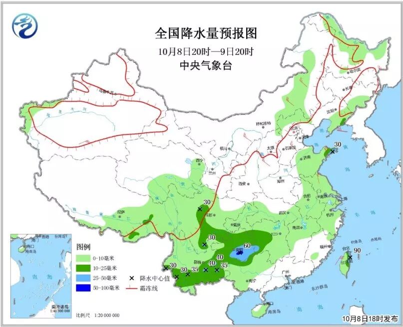 7)10月8日20时至9日20时,内蒙古东北部、青海南部、川西高原北部、西藏北部等地的部分地区有小到中雪或雨夹雪,东北地区北部和东南部、黄淮东部、江淮、江南大部、西南地区大部、华南西部、西藏中东部和台湾岛等地部分地区有小到中雨。