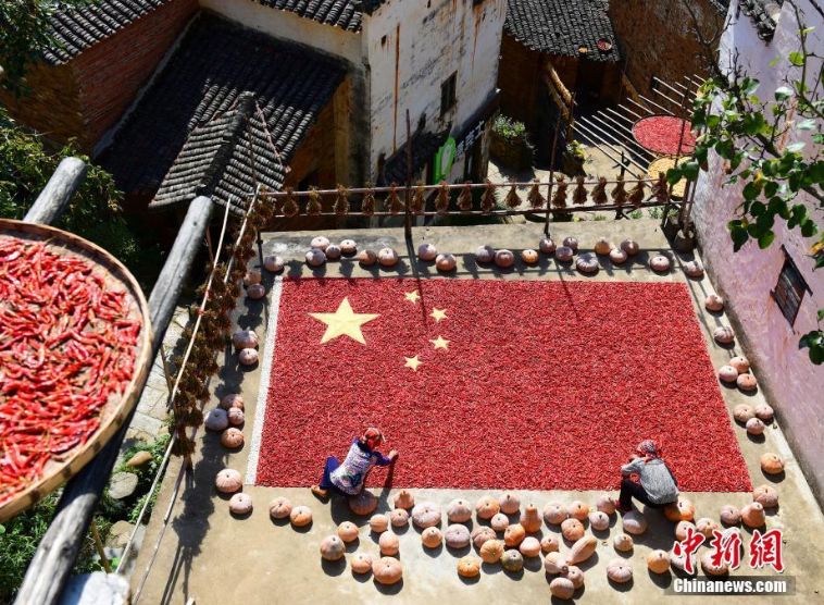 3)婺源大妈纯手工用200余斤辣椒串起国旗,为祖国庆生。