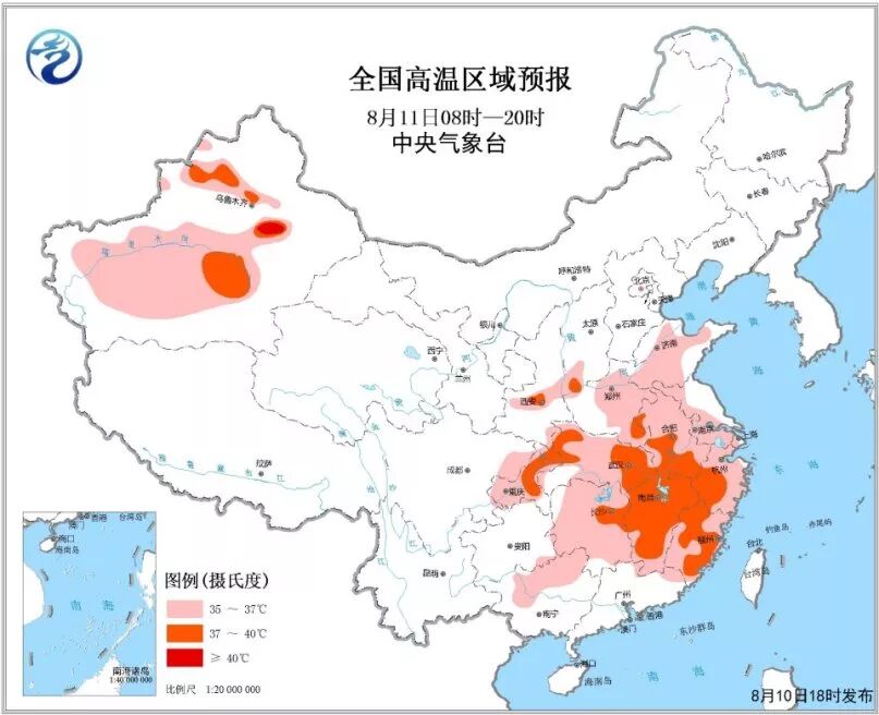 6)预计8月11日白天,陕西关中地区、黄淮中西部、江淮中西部、江汉大部、江南、重庆、广西东北部及新疆南疆盆地和沿天山一带等地的最高气温有35~36℃。