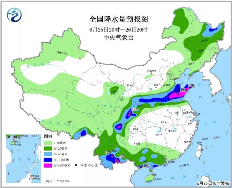 7)6月25日20时至26日20时,山东大部、河南北部、山西南部、陕西中部、甘肃东部、四川盆地西部等地的部分地区有大雨或暴雨,山东中部、四川盆地西北部和西南部局地大暴雨(100~180毫米)。