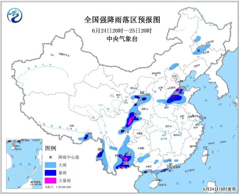 6)6月24日20时至25日20时,黄淮、四川盆地等地有强降雨。山东中西部、河南北部、广西南部沿海和北部、广东西南部沿海和北部、四川盆地西部和北部、云南东部和西部、贵州西南部、甘肃东部和南部、宁夏、陕西南部等地的部分地区有大雨或暴雨,局地大暴雨。