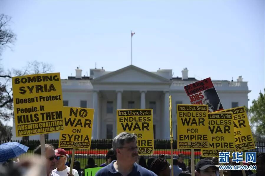 3)美国华盛顿白宫北侧民众集会抗议对叙利亚进行军事打击,批特朗普是“战争动物”。阿萨德:叙用70年代导弹击退了美国侵略。法国对叙动武后第2天,马克龙:将于5月访俄。