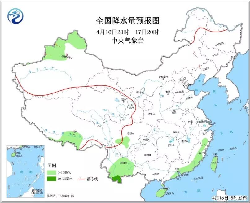 5)4月16日20时至17日20时,西藏中部偏南、川西高原南部等地的部分地区有小雪或雨夹雪。新疆西北部、浙江南部、福建中南部、广东南部、云南中南部、四川盆地西南部及台湾等地有小到中雨,上述局部地区将伴有短时强降水等强对流天气。