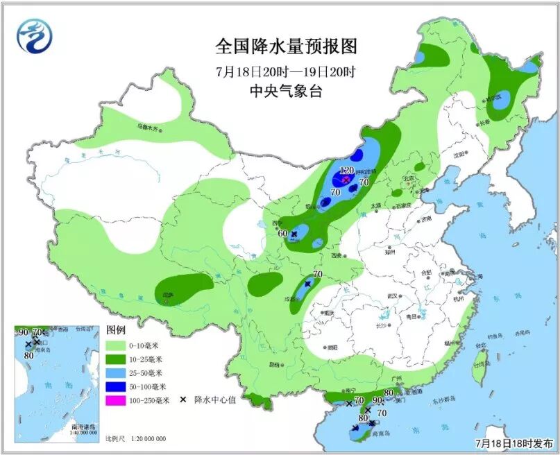 6)7月18日20时至19日20时,内蒙古河套地区将有较强降雨。西北地区中东部,内蒙古中部和东北部、四川盆地西北部、华南南部、海南岛等地的部分地区有中到大雨。其中,内蒙古河套地区、宁夏北部、海南岛北部、广西南部沿海、广东西南部沿海等地局地有暴雨或大暴雨。