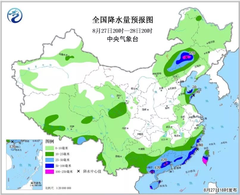 7)8月27日20时至28日20时,内蒙古中部和东南部、河北北部、山东中东部和南部、湖南中西部和南部、江西南部、浙江南部、福建东部、云南东南部、广西东部和西南部、广东、海南岛东部和南部等地的部分地区将有短时强降水天气,小时雨强20-50毫米,局地可达60毫米以上;另外,青海南部、甘肃南部、河北北部、山东东部和四川北部等地的局地将有雷暴大风或冰雹天气。