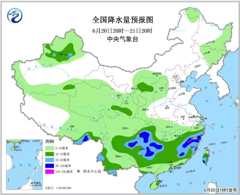 6)6月20日20时至21日20时,重庆南部、贵州北部和中东部、江西东南部、浙江南部、福建西部和北部等地的部分地区有大到暴雨,福建西北部局地大暴雨。