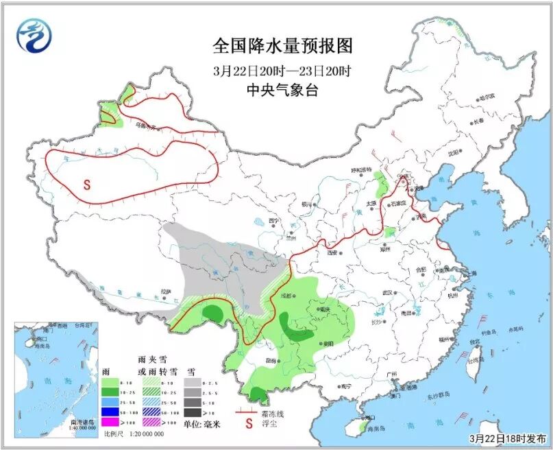 6)3月22日20时至23日20时,西藏东北部和南部、青海南部、川西高原中北部等地的部分地区有小雪或雨夹雪;西南地区大部等地有小雨或阵雨,局地中雨。内蒙古中部、河北西北部等地的部分地区有4~5级风;南疆盆地局部地区有扬沙或浮尘天气。