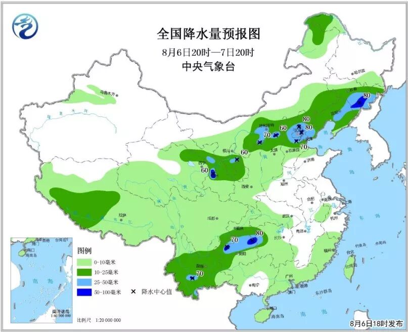 6)8月6日20时至7日20时,青海东北部、甘肃中部、宁夏大部、内蒙古中部偏南、东南部和东北部、山西北部、河北中北部、北京、天津、东北地区中南部及重庆南部、湖南西部、贵州中北部、云南大部、西藏西南部等地的部分地区有中到大雨,局地有暴雨。