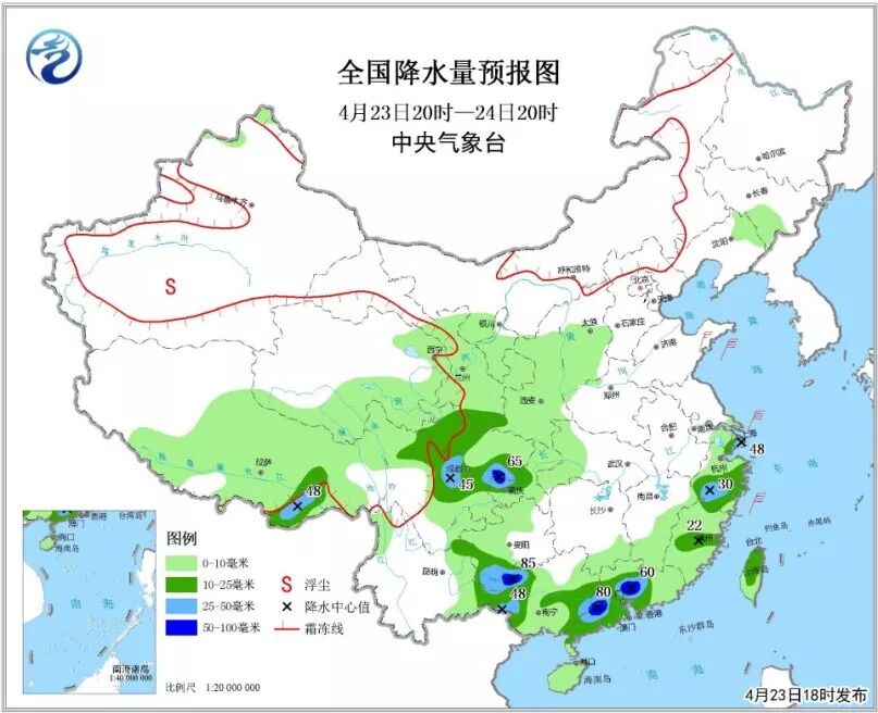 6)4月23日20时至24日20时,四川盆地中部、川西高原东北部、江南东部部分地区、华南西部和中南部、贵州南部、云南东部、西藏东南部等地有中到大雨,其中四川盆地东部、广西西部、贵州南部、广东西部和中部等地的部分地区有暴雨(50~85毫米),上述局部地区将伴有短时强降水和雷暴大风等强对流天气。