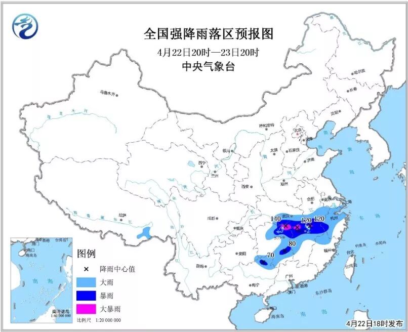 6)4月22日20时至23日20时,湖北南部、湖南北部和东部、江西中北部、安徽南部、浙江西部和北部、福建西北部、广西东北部等地的部分地区有大到暴雨,其中,湖北东南部、湖南东北部、江西北部等地局地有大暴雨(100~140毫米),上述局地并将伴有短时强降水、雷暴大风或冰雹等强对流天气。
