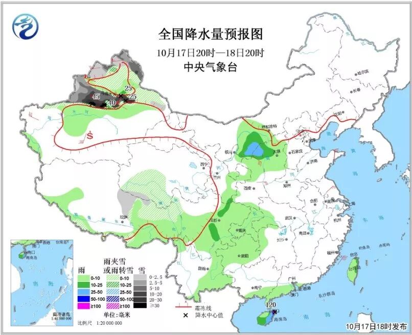 7)10月17日20时至18日20时,新疆北部有小到中雪或雨夹雪,新疆伊犁河谷和北部山区等地有大到暴雪、局地大暴雪。内蒙古中西部、西北地区东北部、山西西部、广东南部沿海、海南岛等地有中到大雨,海南岛东部局地暴雨到大暴雨(100~120毫米)。