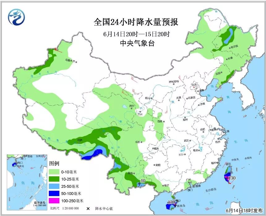 7)云南海南台湾将有较强降水;东北地区多雷雨局地强对流。6月14日20时至15日20时,西藏东部、新疆西部、黑龙江西部、辽宁东部和南部、海南岛、台湾岛、云南西北部和东部等地有中到大雨,西藏东南部、海南岛、台湾岛等地有暴雨到大暴雨(100~150毫米),上述局部地区将伴有短时强降水等强对流天气。