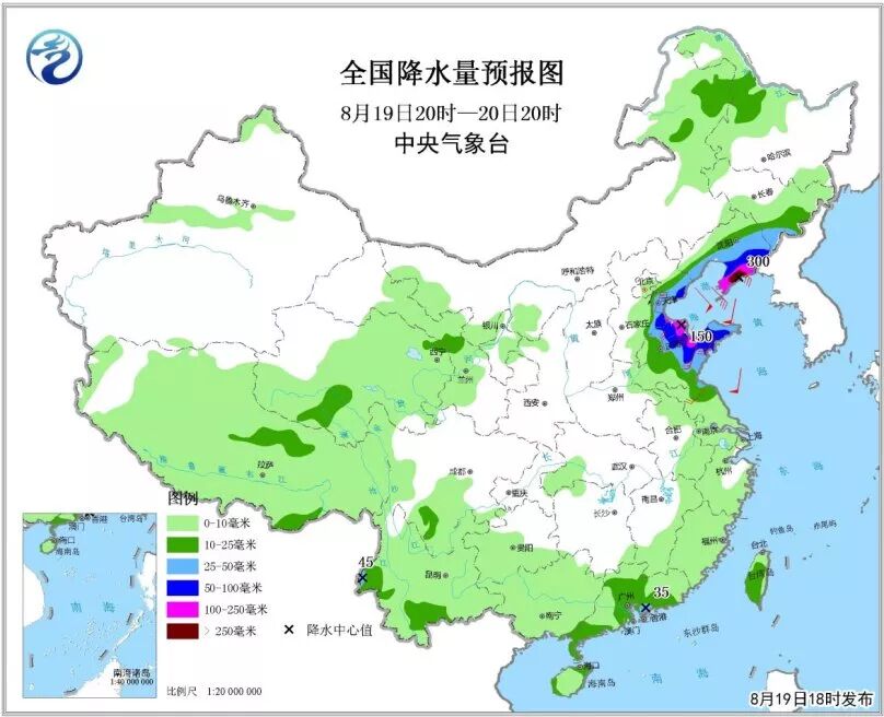 6)8月19日20时至20日20时,山东中东部、环渤海、辽宁南部等地有强降水。其中山东东北部、辽宁东南部等地部分地区有大暴雨,局地有特大暴雨(250~300毫米),上述部分地区伴有短时强降水(小时雨量20~60毫米,最大可达70毫米以上),局地有雷暴大风等强对流天气。