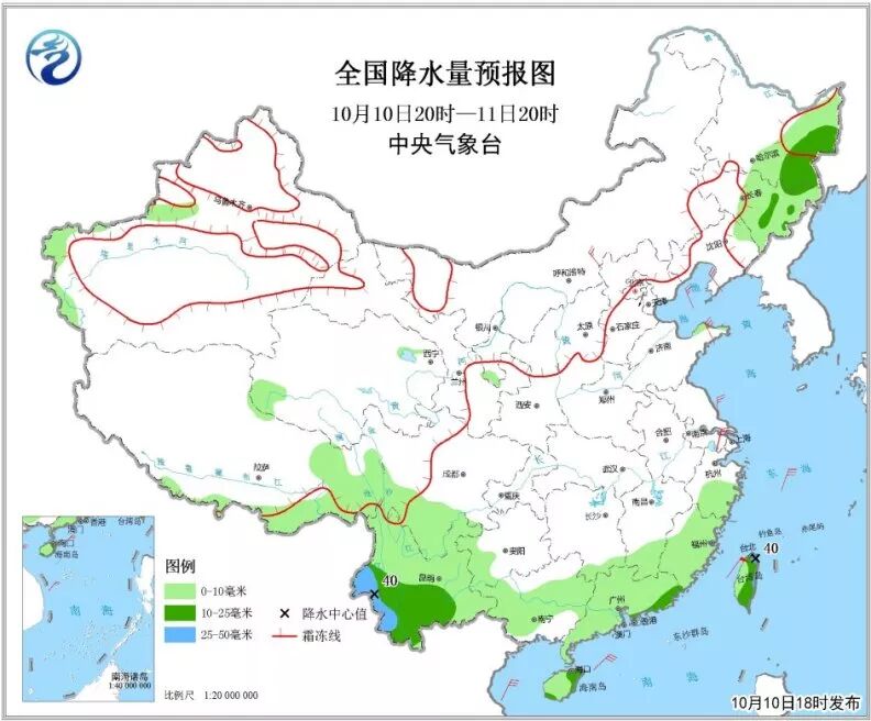 6)10月10日20时至11日20时,黑龙江东部、吉林东部、青藏高原东部等地有小到中雨(雪)或雨夹雪。四川南部、云南、贵州西部、江南东部和南部、华南大部及台湾岛等地部分地区有小到中雨,其中,云南西南部等地局部有大雨(25~40毫米)。