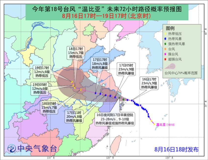 6)受台风“温比亚”影响,16日夜间至18日,黄淮、江淮、江汉、江南北部等地将有大到暴雨,局部有大暴雨。预计8月16日20时至17日20时,浙江北部、江苏南部、上海南部、安徽东部和大别山区局部地区有大暴雨(100~180毫米)。