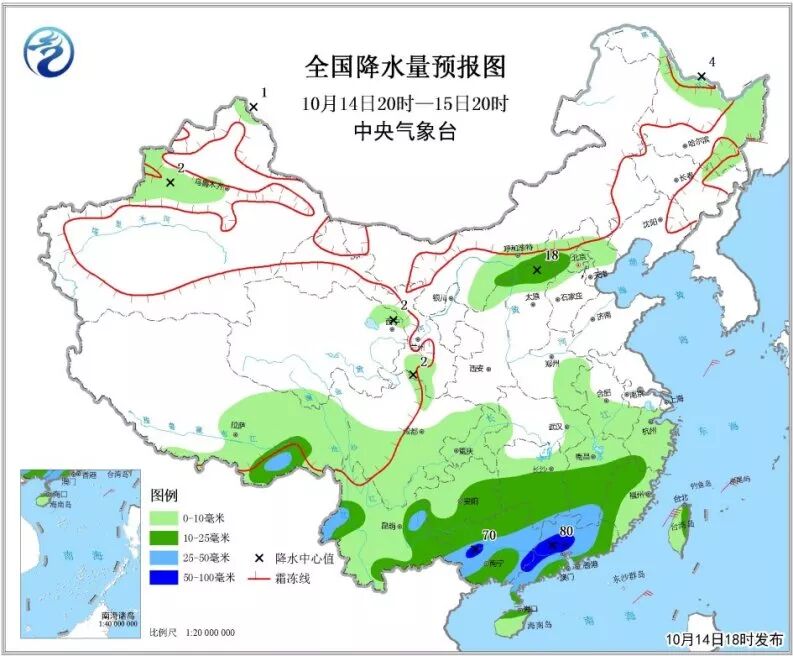 6)10月14日20时至15日20时,华北中北部、江南、华南、西南地区大部、西藏东部等地的部分地区有小到中雨,其中,西藏东南部、云南西部、广西西南部和东部、广州中北部等地的部分地区有大雨,局地暴雨(50~80毫米)。