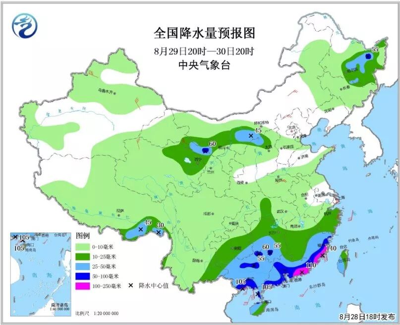 7)8月29日20时至30日20时,黑龙江中东部、内蒙古西南部、西北地区中北部、江南、江汉西部、华南、云南东部、贵州、海南岛、台湾岛等地的部分地区有中到大雨。内蒙古中部、华北北部、辽东半岛、山东半岛、甘肃西部、新疆北部山口地区、江南东部沿海及北部湾局地有4~6级风。