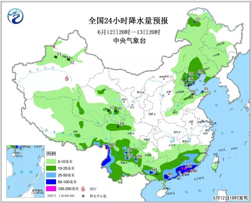 6)12日20时至13日20时,西南华南地区暴雨蓝色预警;其中,云南西北部、广东中部和南部沿海局地有大暴雨。上述部分地区并伴有短时强降水,局地有雷暴大风和冰雹。华北东北等地有强对流。