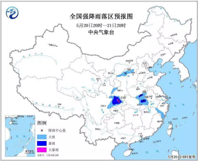 7)5月20日20时至21日20时,西北地区东部、西南地区东部、华北北部、江汉、江淮西部、河南南部、江南东部等地有中到大雨,四川盆地中北部、河南东南部、湖北东北部等地的部分地区有暴雨,局地大暴雨(100~110毫米)。